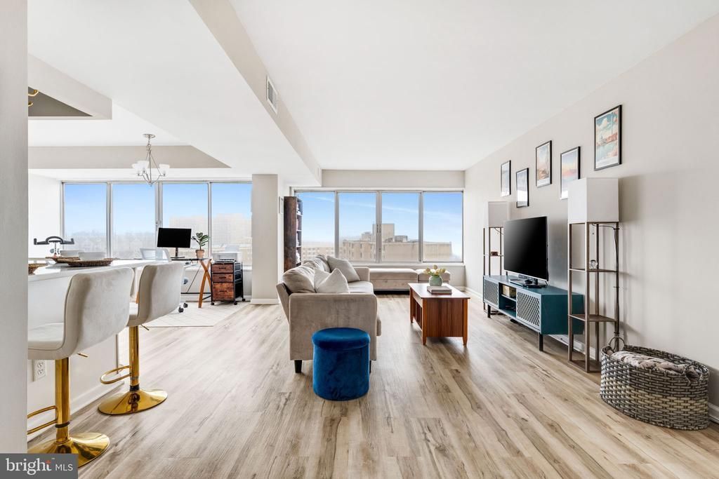 Welcome to Pavilion On the Park, where sweeping views and thoughtful updates come together in a beautifully renovated 14th-floor condo. From the moment you open the door, your eye is drawn straight to the wall of windows and the expansive views beyond - an instant “wow” that fills the home with natural light and sunset vistas. The space has been stylishly updated with durable luxury vinyl plank flooring and a crisp white kitchen that opens to the living area, creating a bright and seamless flow. The kitchen features stainless steel appliances including a high-end GE Café range, making it as functional as it is attractive. A dedicated dining area offers space for meals or entertaining. The spacious bedroom includes a huge walk-in closet, while the renovated bathroom continues the home’s fresh, modern feel. Pavilion On the Park is known for its amenities and beautiful park-like setting along Holmes Run. Residents enjoy a swimming pool, fitness center, tennis courts, sauna, party room, and walking trails just outside the door. The location is incredibly convenient - walk to the library, Cameron Station Farmers Market, and various shops and restaurants, and easily access 395, bus routes, Old Town Alexandria, Shirlington, and Washington, D.C.